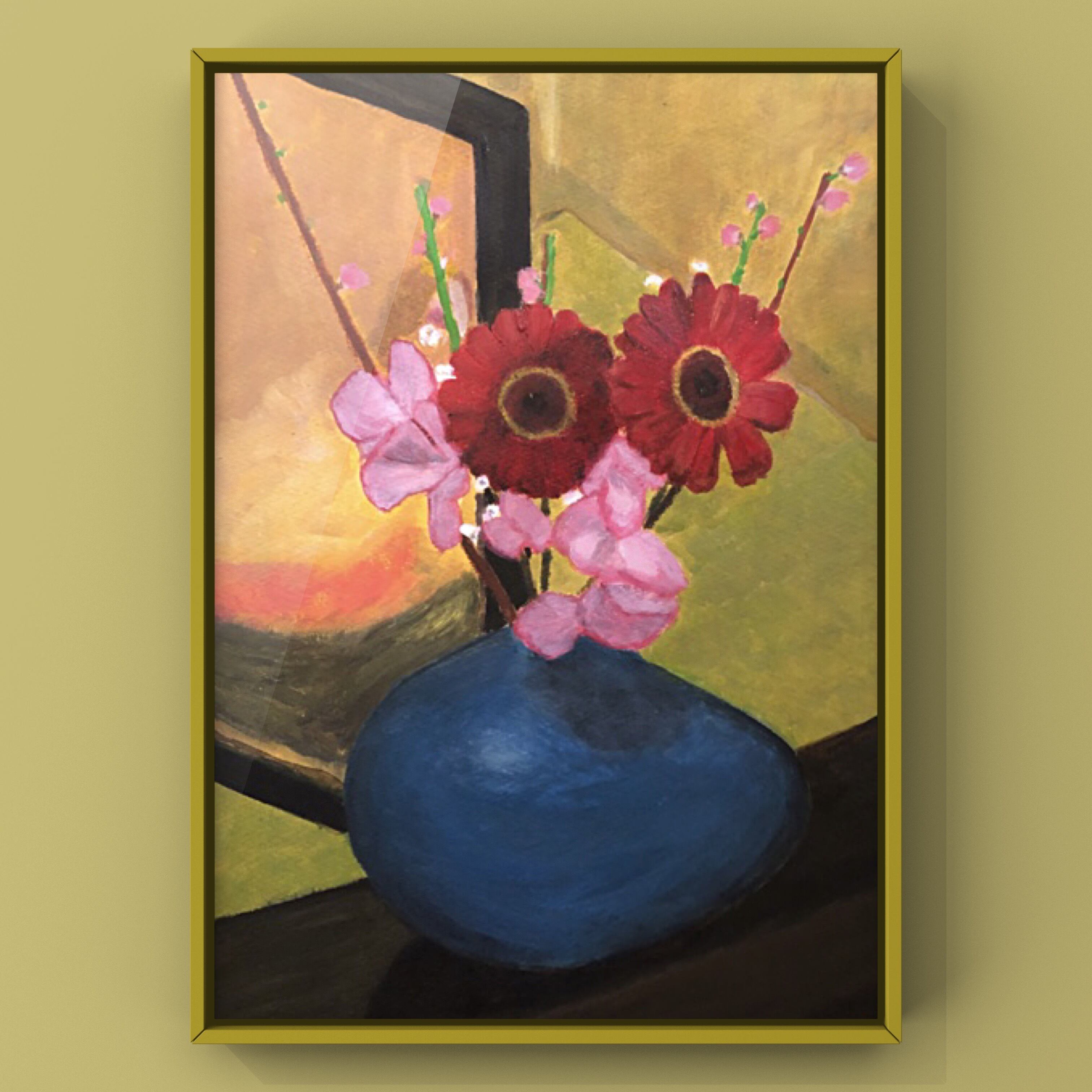 -- 床の間に置いたお雛様の飾り花に、桃とガーベラ、スイートピーと、カスミソウを添えて、ブルーグレーのアシメトリーの花器と合わせました。