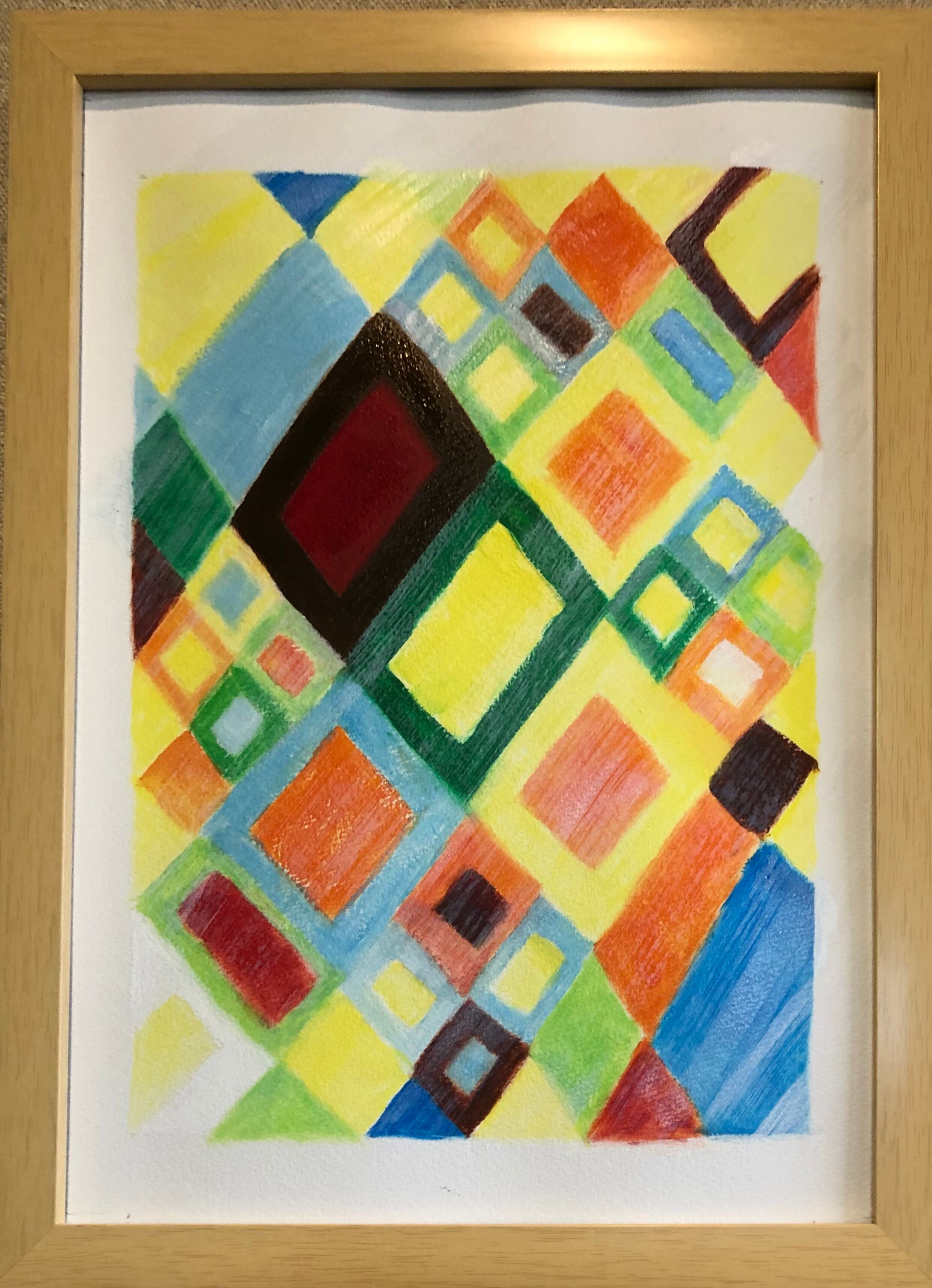 同じ色が隣り合わない配色です。左上の赤とブラウンのスクエア以外は白色を薄くかけてあります。
