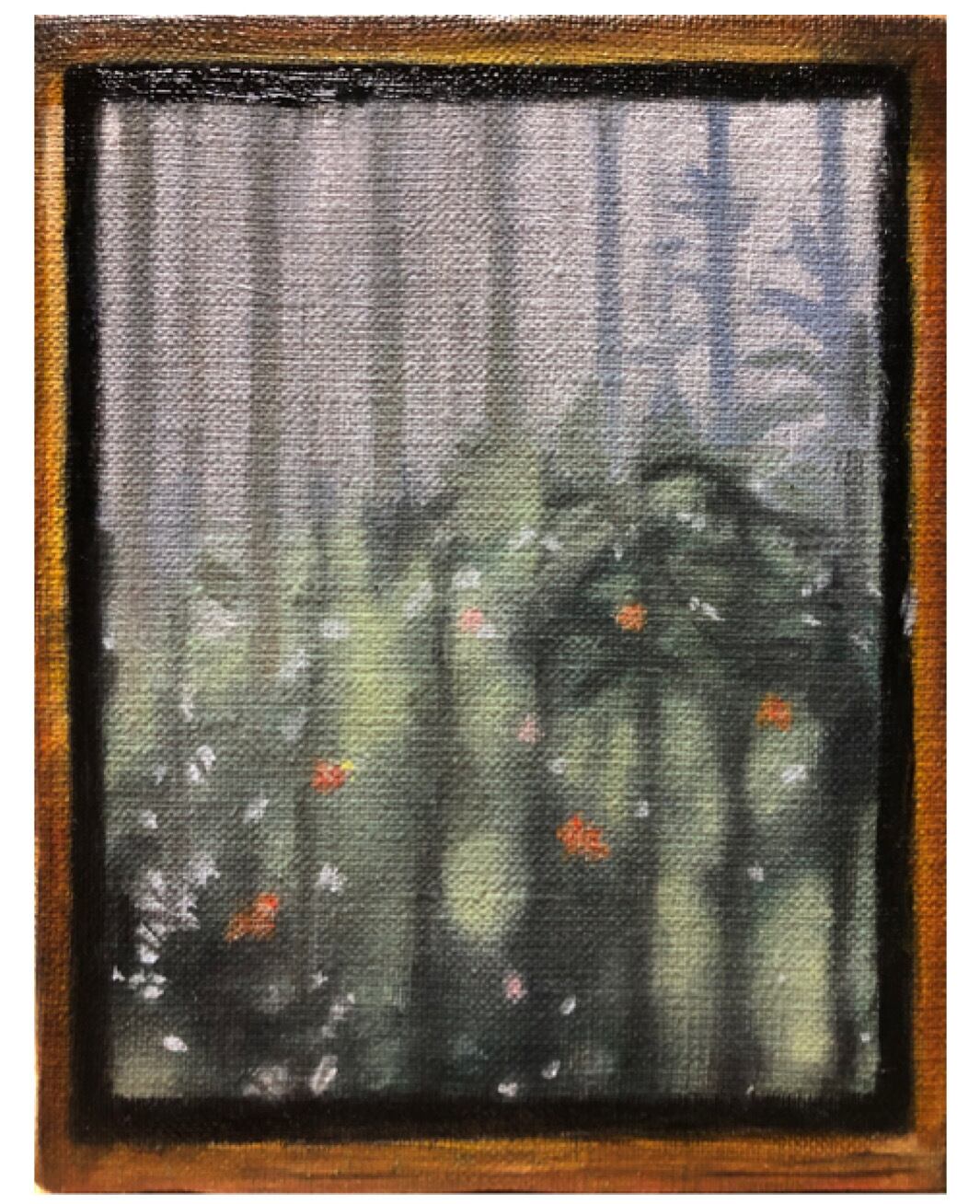 M0サイズのキャンバスに描きました。東の窓の磨りガラスに朝日が作る金木犀と柵の影は、形も色彩も曖昧です。