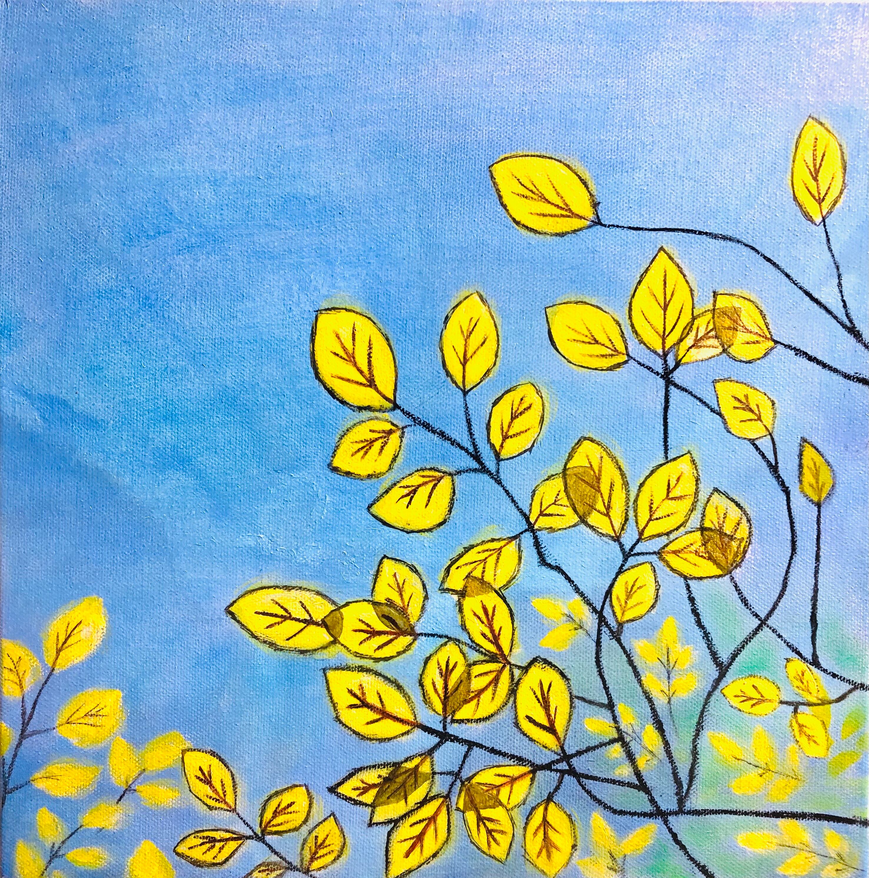 見上げた空のイメージ画になります。スカイブルーの空に、光を通して輝く木の葉をイメージしました。近い平和を祈念。
