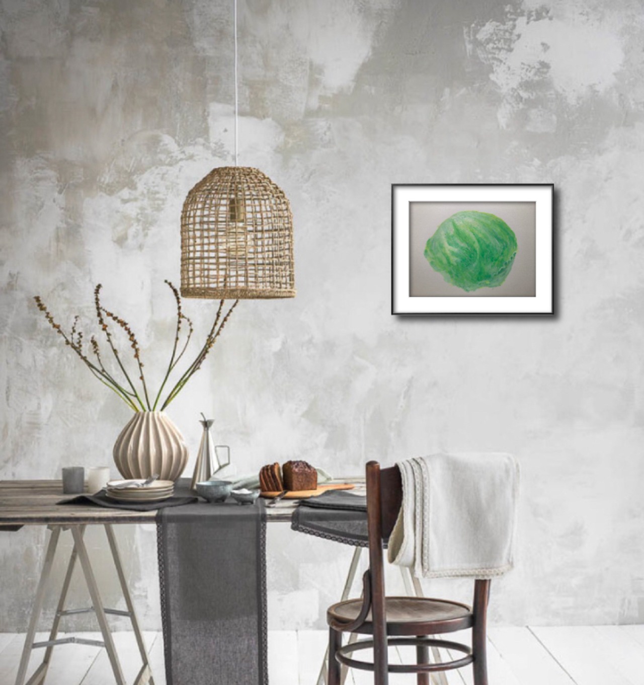 外葉を外した薄緑色のレタスの玉の2枚目は山脈あり谷ありです。葉物野菜は個体で形が違い、種類がわかるように特徴を表現できるよう、また新鮮さを出せるように短時間で仕上げました。