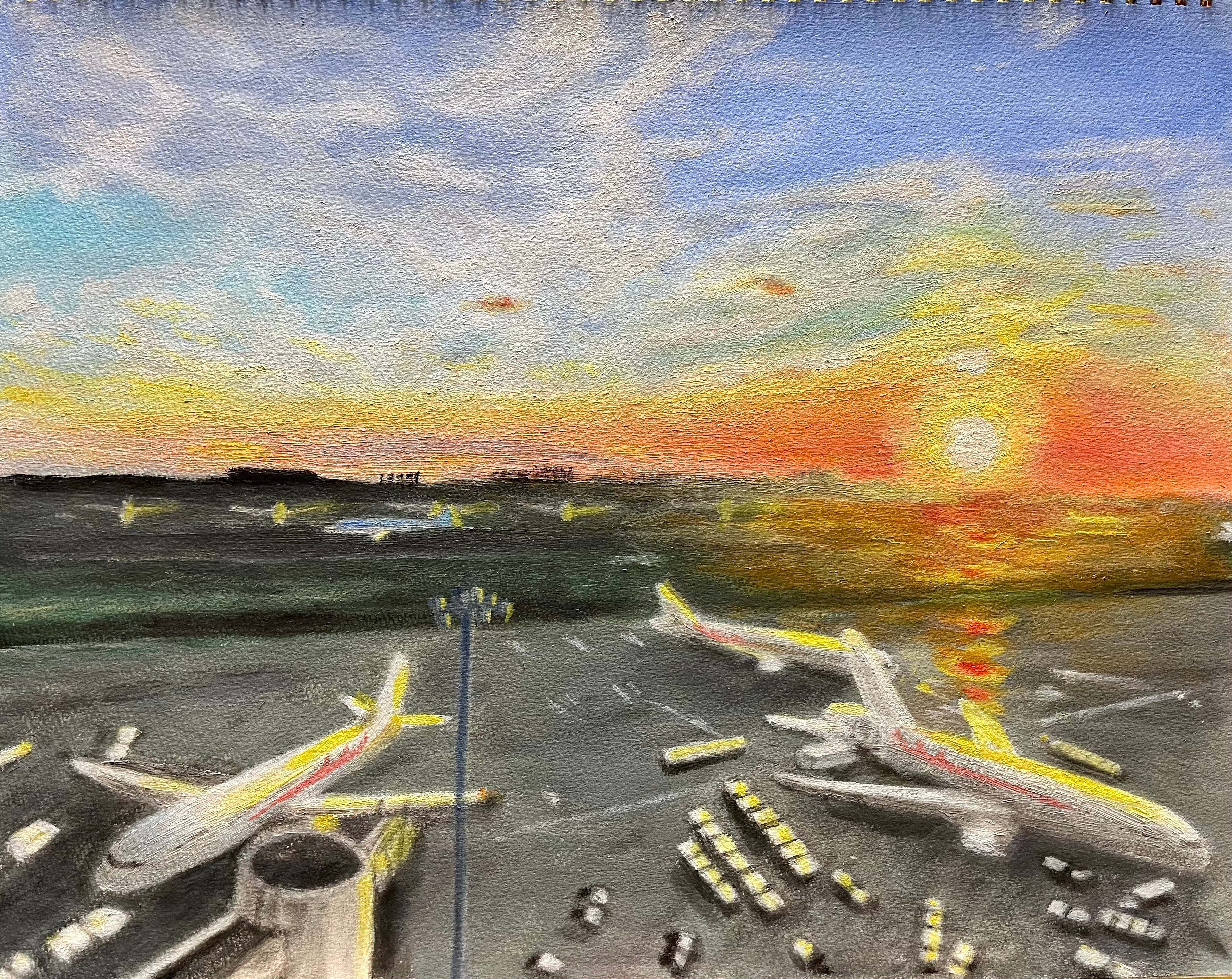 羽田空港の滑走路が見渡せる展望台から夕陽も見えました。荷物を載せるコンテナが思いの外たくさんあり、中ほどと向こうにも滑走路があります。